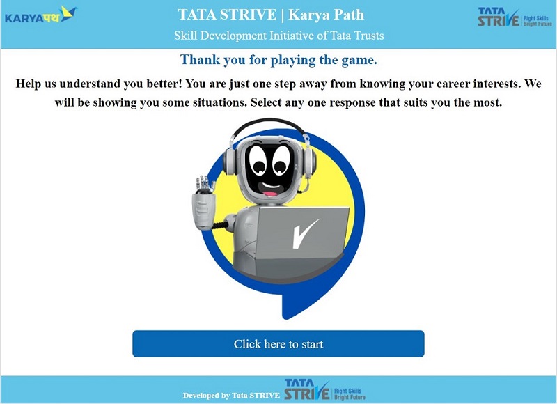 To address this issue of career counselling and fill the gaps with the right information and efficient tools, Tata STRIVE indigenously developed a self-assisted career counselling solution called Karya Path.