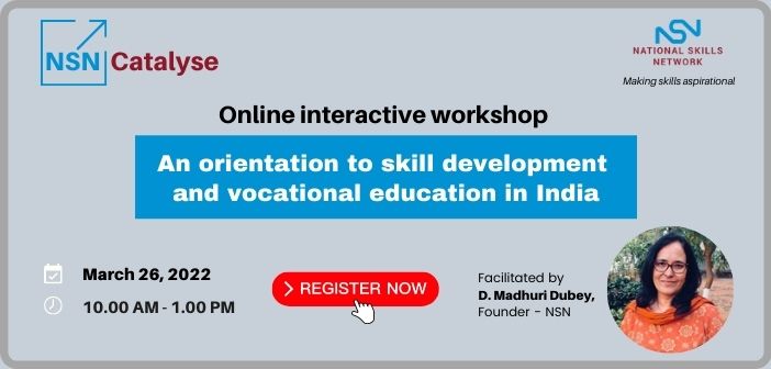 National Skills Network (NSN) is organising an online interactive workshop under the series, “NSN Catalyse”. The workshop is entitled “Skill development and vocational education in India: An orientation workshop”.